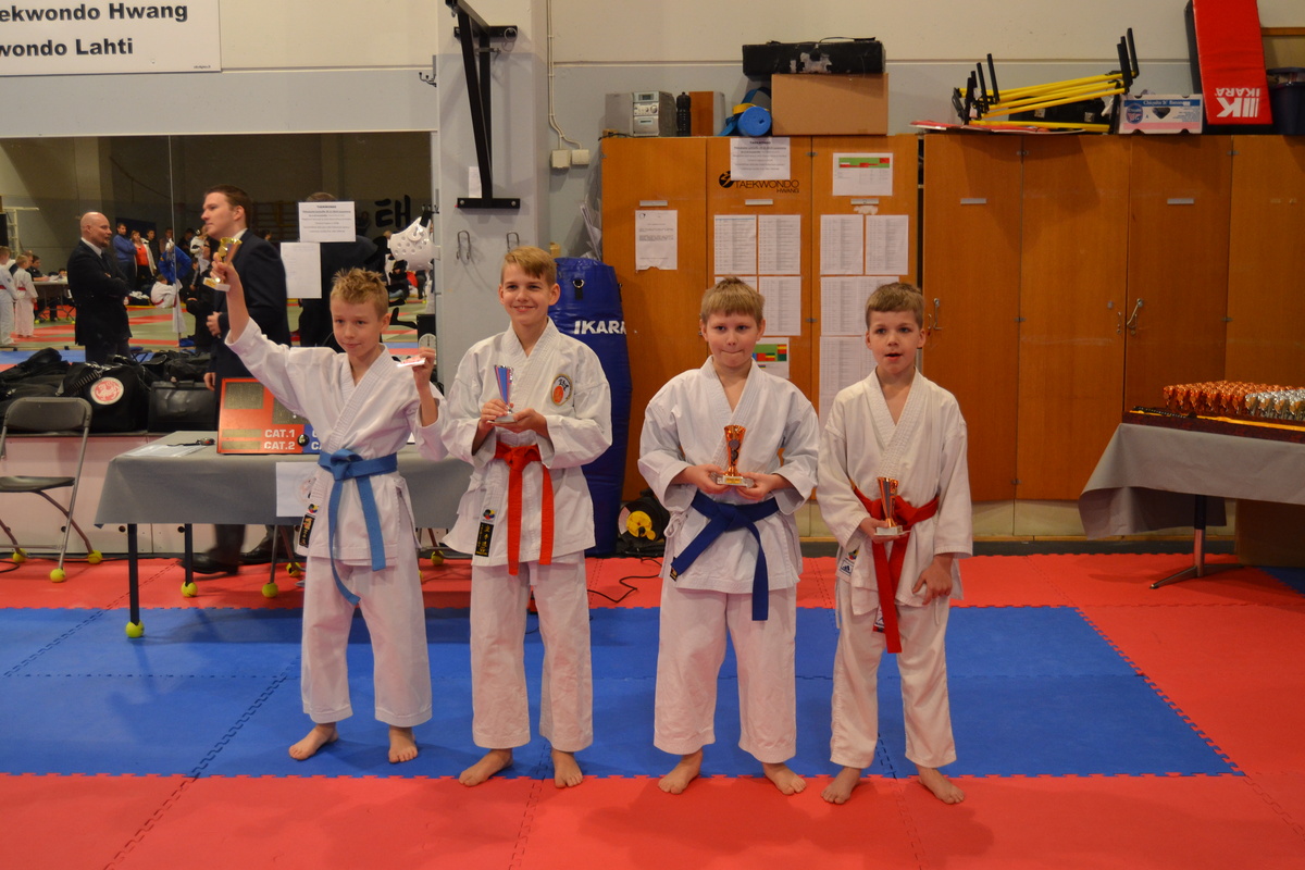 Päivä alkoi katasarjoilla 10-11 -vuotiaiden sarjassa kilpailivat Joni Lehtonen ja Joel Lehtonen. Joni voitti ensimmäisen parinsa, mutta toisen hän hävisi sarjan hopeamitalistille. Joel hävisi oman ottelunsa sarjan voittajalle. Alle 12- vuotiaiden sarjassa ei käyty keräilyjä, joten molemmat ottivat itselleen pronssin. Kadettien katasarjassa mukana oli myös kaksi Ylöjärveläistä. Jimi hävisi ensimmäisen ottelun niukasti yhdellä lipulla ja keräilyssä hän voitti pronssin. Jimi Lehtonen voitti ensimmäisen ottelunsa ja finaalissa hän taipui sarjavoittajalle saaden hopeaa sarjasta. Kumiten 10-11-vuotiainen pieneimpien sarjassa otteli Joni Lehtonen. Jonilla otteli hyvin ja hyviä suorituksia riitti, mutta tällä kertaa se ei riittänyt. Joel Lehtonen ottelin saman ikäsarjan isompien sarjassa. Hän hävisi ottelunsa sarjan hopeamitalistille ja keräilyitä ei käyty näissä sarjoissa. kumiten 12-13 –vuotiaiden isompien sarjassa otteli Miikka Salonen. Ensimmäisen ottelun hän voitti ja toisen hän hävisi sarjavoittajalle. Sarjassa käytiin keräilyt ja Miikka otteli pronssista ensin Tampereen Nuutti Vuorta vastaan voittaen ottelun ja semifinaalissa vastaan tuli Lohjan kamppailukeskuksen Rasmus Kiiskinen. Ottelun voitti Miikka, voittaen pronssin. Kadettien alle 61 kiloisten sarjassa otteli Miska Salonen. Ensimmäisen ottelun hän hävisi ja meni keräilyihin. Keräilyissä vantaan tuli Renshin-Kanin Eetu Vienonen. Miska voitti ottelun mennen semifinaaliin. Siinä vastaan tuli Hämeenlinnan Niko Mantere. Miska voitti ottelun, voittaen pronssin. |
