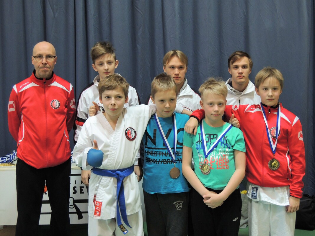 Hämeenlinnan Karateseuran järjestämä Tawastia Open avasi kotimaan kilpailukauden sekä uuden Suomi Cup kilpailusarjan. Kilpailu keräsi yli 240 ilmoittautumista 22 seurasta. Ylöjärveltä kilpailemaan lähti seitsemän kilpailijaa valmentajineen ja kannustusjoukkoineen. Aamupäivällä kilpaili alle 14 vuotiaat kilpailijat. Alle 12-vuotta alle 3 vuotta harrastaneiden katasarjassa otteli Ylöjärveltä kolme kilpailijaa, Lauri Heinonen, Luukas Nummela sekä Veeti Luoma. Kaikki kolme poikaa karsiutuivat ensimmäisellä kierroksella, mutta kaikki kolme pääsivät keräilemään. Pidemmälle pääsi Veeti, joka hävisi pronssiottelussa Kuopion Tuomas Rekolalle. Tämä kolmikko otteli vielä joukkue katasarjassa. Sarjasta tuli pronssia. Alle 14 vuotiaiden katasarjassa otteli Topias Paattimäki. Topias voitti ensimmäisen katansa, mutta hävisi seuraavan ja keräilyihin ei tullut mahdollisuutta. Alle 12-vuotiaiden +35 kiloisten kumitesarjassa otteli Lauri Heinonen sekä Veeti Luoma. Lauri koki ensimmäisessä ottelussa tappion sarjan voittajalle. Samassa ottelussa hän sai osuman kasvoihin ja lääkäri ei antanut lupaa osallistua keräilyihin. Veeti voitti ensimmäisen ottelunsa, mutta hävisi seuraavan. Keräilyissä Veeti voitti seuraavan ottelun mennen pronssi otteluun. Veeti voitti pronssiottelun. Alle 14-vuotiaiden -45 kiloisten sarjassa Topias Paattimäki hävisi 3-1 Oulun Eetu Latvalalle ja keräilyihin ei mahdollisuutta. Kadettien alle 16-vuotiaiden -70 kiloisten sarjassa otteli Miikka Salonen. Miikka voitti puhtaasti kaikki kolme otteluaan antamatta pistettä vastustajalle, voittaen sarjasta kullan. Junioreiden alle 18-vuotiaiden -61 kiloisten sarjassa otteli Nuutti Vuori ja Miska Salonen. Sarja käytiin poolina eli kaikki ottelivat toisiaan vastaan. Miska voitti molemmat ottelut voittaen kultaa. Nuutti Voitti yhden ottelun ja hävisi toisen, voittaen sarjasta hopeaa. |