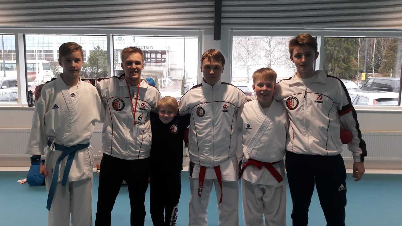 Perinteiset Orimattilan karatekilpailut käytiin lauantaina 23.3. Kilpailijoita kilpailuissa oli yli kaksisataa 37 eri seurasta. Ylöjärveltä kilpailemaan lähti viisi kilpailijaa ja valmentajana toimi tällä kertaa Miska Salonen. Kata eli liikesarjat aloittivat kilpailut. Ensimmäiseksi kataamaan pääsi Miska Vastamäki, sarjassa alle 12-vuotiaat alemmat vyöarvot. Miska teki katan Sandan, mutta tehdessään unohti yhden kian (huuto) ja vastustaja vei voiton lipuin 5-0. Vastustaja meni finaaliin ja Miskalle avautui mahdollisuus keräilyihin. Keräilyissä ja se oli pronssiottelu, Miskalle vastaan tuli Orimattilan Olkkonen Matvei. Miska teki toisena katana Nidanin. Ottelu oli tasainen, mutta Matvei otti pronssin tuloksella 3-2. Alle 14-vuotiaiden katasarjassa otteli Lauri Heinonen ja Veeti Luoma. Lauri teki ensimmäisessä katassaan Unsun kuopion Tuomas Rekolaa vastaan. Tällä kertaa Tuomas vei ottelun tuloksella 4-1. Tuomas ei edennyt kilpailuissa, joten Laurille ei mahdollisuuksia keräilyihin. Veeti Luomaa vastaan tuli sipoon Johannes Nyholm. Johannes teki virheen ja Veeti voitti ottelun Jion katalla. Seuraavalla kierroksella Veeti teki katan Empi. Ottelu oli tasainen, mutta oulun Eeli Ylinampa vei ottelun tuloksella 3-2. Pronssiottelussa Veeti teki katan BassaiSho kuopion Tuomas Rekolaa vastaan. Tuomas otteli itselleen pronssin tuloksella 5-0. Alle 12-vuotiaiden -35 kiloisten sarjassa otteli Miska Vastamäki. Sarja käytiin poolina, jolloin kaikki kilpailijat ottelivat toisiaan vastaan. Miska hävisi ensimmäisen ottelunsa, mutta voitti puhtaasti kaksi seuraavaa, vieden sarjasta hopean. Alle 14-vuotiaiden alle 55 kiloisten sarjassa otteli Veeti Luoma ja Lauri Heinonen. Ensimmäisessä ottelussa vastaan tuli imatran Lauri Vakkilainen. Vakkilainen vei ottelun tuloksella 6-1, mutta hän ei edennyt finaaliin asti, joten Veetin ottelut oli tältä päivältä oteltu. Heinosen Laurille vastaan tuli Haikkonen Valtteri. Ottelussa ei saatu pisteitä ja lopputulos meni lippuäänestykseen. Valtteri vei äänestyksen niukasti 3-2 ja Laurin kisaamiset oli kisattu kun paikkaa keräilyihin ei tullut. Seuraavaksi oteltiin miesten +75 kiloisten sarja. Nuutti Vuori otteli entistä seurakaveria Mauricio Avilesia vastaan. Nuutti johti ottelua 2-0, mutta Mauricio otti liian monta varoitusta, joten tulokseksi Nuutille 8-0. Seuraavaksi Nuuttia vastaan tuli Venäläinen Arttu. Nuutti voitti Artun luvuin 4-0 mennen samalla finaaliin Aaro Tuomista vastaan. Nuutilla vanha vamma äityi kipeäksi, joten finaali jäi tällä kertaa väliin ja tuloksena hopea. Päivän viimeisessä sarjassa, alle 18-vuotiaiden yhdistetyssä, otteli Miikka Salonen. Miikka otteli ensimmäisen ottelun Mäntsälän Sisu Ågrenia vastaan. Ottelu päättyi Miikalle 6-1. Seuraavassa ottelussa vastaan tuli kuopion Eetu Tuovinen. Miikka sai otettua kaksi pistettä, voittaen ottelun tuloksella 2-0 ja mennen samalla finaaliin. Finaalissa vastaan asettui hämeeninnan Maksimilliam Ollila. Max otti ottelussa ensimmäisen pisteen ja sai samalla ensimmäisen pisteen edun itselleen. Miikka tasoitti ottelun 1-1, mutta tarvitsisi vielä pisteen voittoon, kun Maxilla oli etu itsellään. Miikka sai kovan osuman naamaansa, mutta onneksi pystyi vielä jatkamaan otteluaan. Miikka painosti Maxia loppuun saakka, saaden otettua viimeisillä sekunneilla voittoon tarvittavan pisteen, voittaen samalla sarjasta kultaa. |